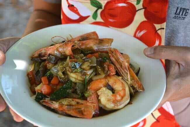 Carrots, mushroom, onion, eggplant, all of these ingredients we added (except the onion, this one is important to add a sweetness that balances the spice of this dish). Many vegetables you can slice or chop and throw in the iron skillet cooking the shrimp and the tasteless coconut oil, chopped chili peppers, and fresh sliced garlic.